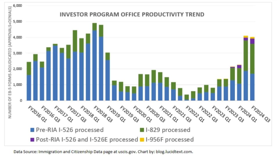 20여년 미국 변호사로 활동하며 지금껏 이민국의 수속이 느려지면 느려졌지 빨라지는 경우는 많이 못 본 것 같습니다. 그러나 최근 발표된 이민국 자료에 의하면 EB5 투자이민 처리 속도가 빨라지고 있음을 알수 있습니다. 아래 이민국 자료에 의하면 코로나 기간 정체되었던 이민국의 처리 속도가 2023년 말부터 많이 회복 되는 모습을 보이고 있습니다. 이민국 수속과 더불어 대사관 수속도 점차 적체가 완화될 것으로 기대하고 있습니다.