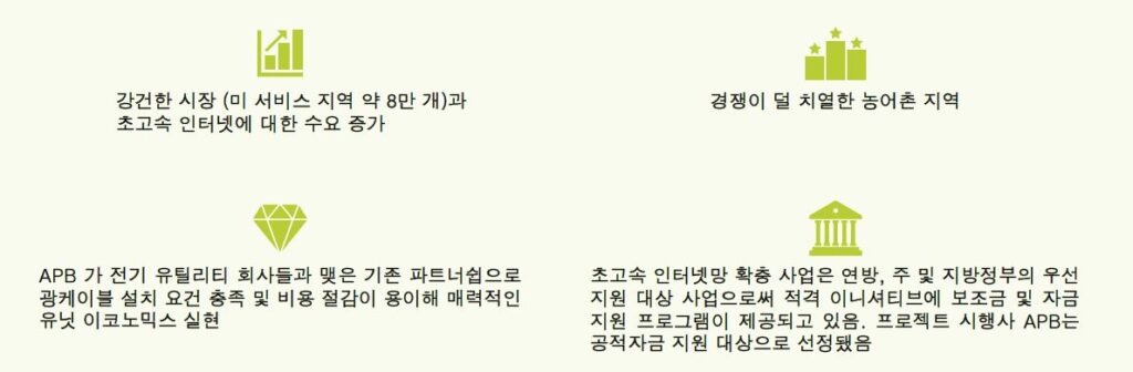 농어촌 지역 브로드밴드 프로젝트 일환으로써, APB는 약 1,200마일에 새로 광케이블망을 설치하고 다수의 브로드밴드 네트워크를 운영해 “농어촌 지역” 카운티 미 서비스 지역에서 집과 회사를 초고속 인터넷망으로 연결할 계획입니다.