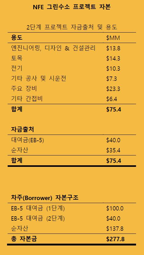 New Fortress Energy (NFE)는 현재 텍사스주 네덜란드에 100 메가와트(MW) 규모의 그린수소 플랜트를 건설하고 있습니다. 건설자금 일부는 2023년 7월 마감된 1억 달러 규모 EB-5 대여 (그린수소 플랜트 EB-5 프로젝트 1단계) 수익금으로 지원받고 있습니다. 그린수소에 대한 매우 견고한 수요와 그린수소 플랜트 예상 생산량 100%를 충족하는 성공적인 장기구매 고객 확보 노력 덕분에 NFE는 그린수소 생산용량을 100MW에서 200MW로 확장하는 계획을 추진하고 있습니다. 이를 위한 전제 조건으로써, 더 큰 200MW 시설 수용을 위한 현장 인프라를 개선할 것입니다. 그린수소 2단계 플랜트 확장 프로젝트 EB-5 대여금은 이러한 인프라 개선에 사용될 예정으로 현장의 전기, 유틸리티 및 기타 거대 인프라 시설과 함께 배관, 기초공사 및 플랜트 관련 기타 설비가 여기에 포함됩니다. 프로젝트 2단계 자금 지출은 2024년 2분기에 시작되어 2025년 4분기에 완료될 것으로 예상됩니다.